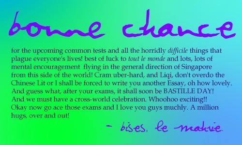 Anyway the trip was fantabulous. I beam and make bel and mel jealous. And the best part of it was standing with gencatlickie at the top of the louvre and just holding hands/thinking/singing softly and looking down at the rest of the world under us, cause that's the sort of thing you do when you're on one of the most celebrated wonders of the world for the first time, and when that happens you always want it to be with either your family or your closest friends, cause that's who you want to share that experience with. I wish mel and bel were there, but I suppose one day if the esplanade or the IR becomes the eighth world wonder we can all visit there together and spam songs too.